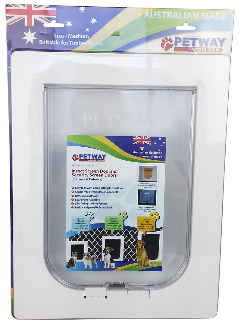 Just cut the hole in Petway Timber Door using provided Template. Squeeze Pet Door Frames together, then the pet door is ready to use. For more fitting information please refer to the product package or visit (www.petway.com.au).